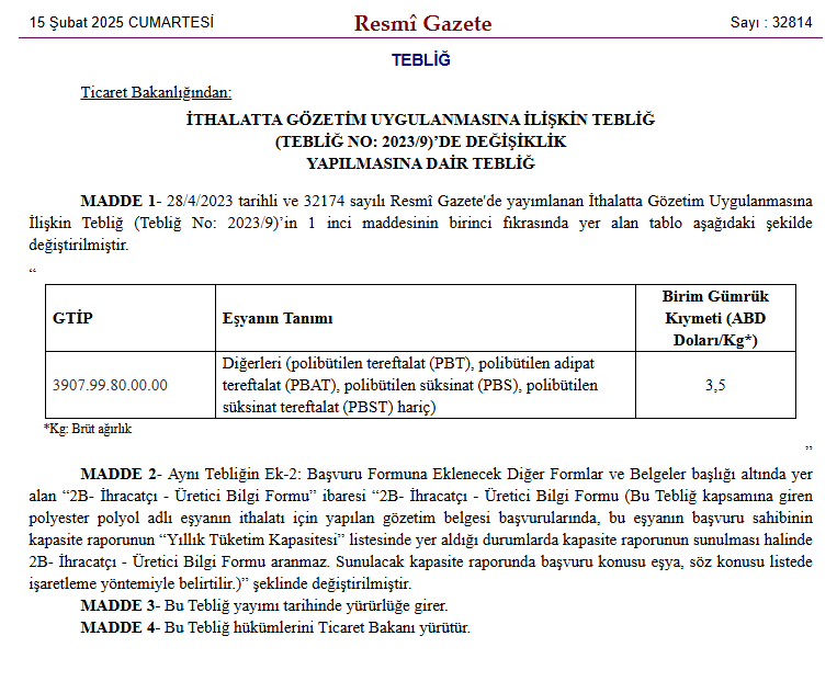 Buna göre, bazı polyester ürünlerin ithalatında gözetim uygulanacak. Kilogram başına 3,5 dolar olarak belirlenen gümrük kıymetinin altındaki diğerleri (polibütilen tereftalat (PBT), polibütilen adipat tereftalat (PBAT), polibütilen süksinat (PBS), polibütilen süksinat tereftalat (PBST) hariç)” olarak kategorilendirilen ürünlerin ithalatında gözetim uygulaması gerçekleştirilecek.