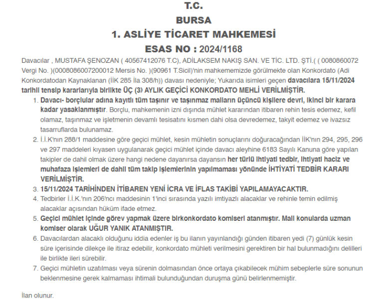 Mahkeme, firmaya 3 aylık geçici mühlet tanırken, mali konularda uzman Uğur Yanık’ı konkordato komiseri olarak atadı.