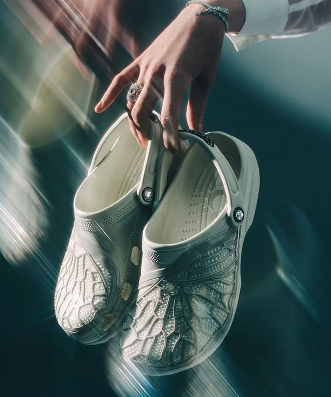 Doğanın zarafetini yakalayan beyaz renkteki Classic Clog’u ışıldayan yusufçuk kanadı şeklindeki kristaller süslüyor. Siyah renkteki Bae Clog ise yükseltilmiş platformu, kristallerle ve ay temalı detaylarla süslenmiş dış yüzeyiyle ekstra bir ışıltı sunuyor.